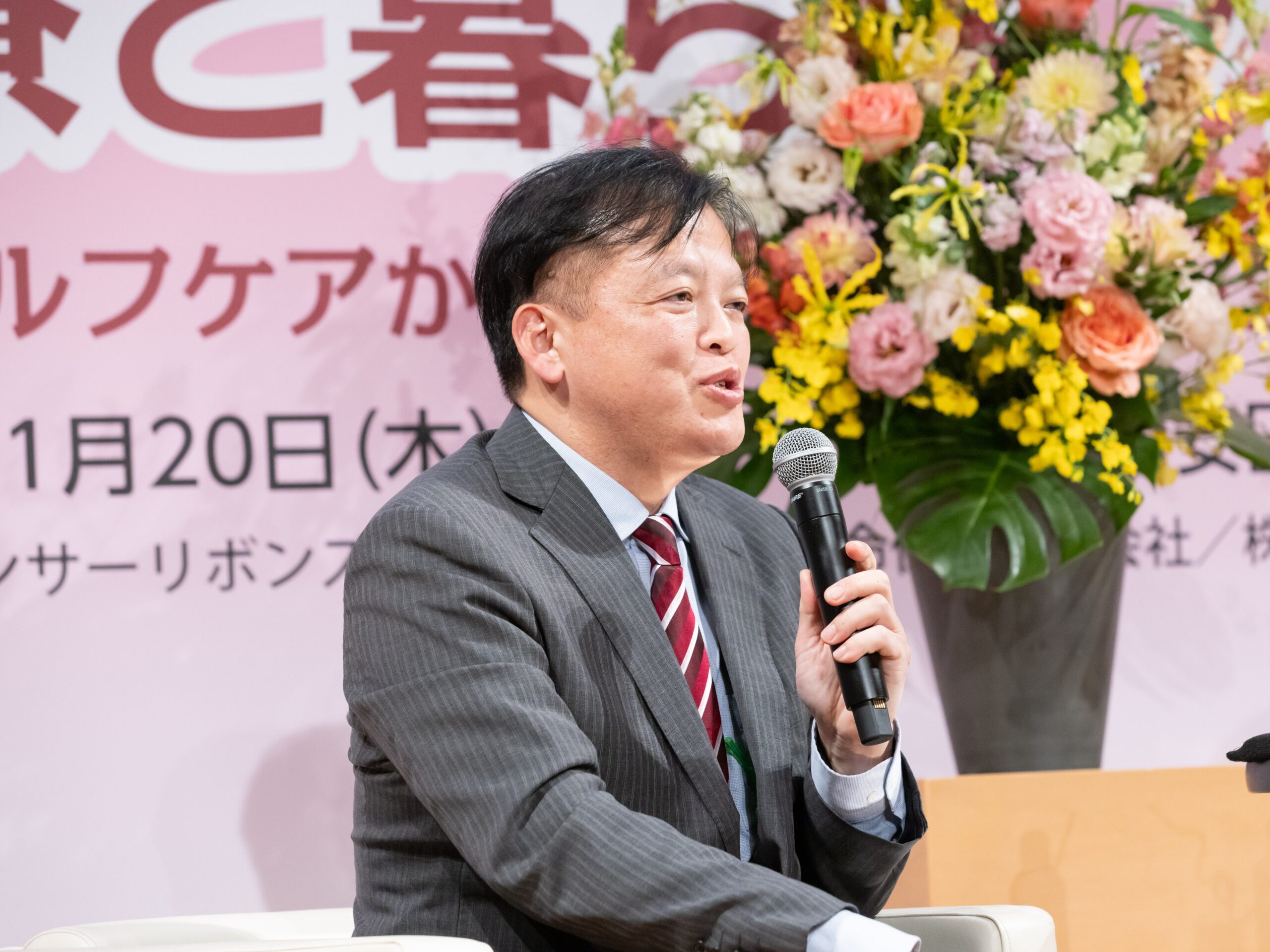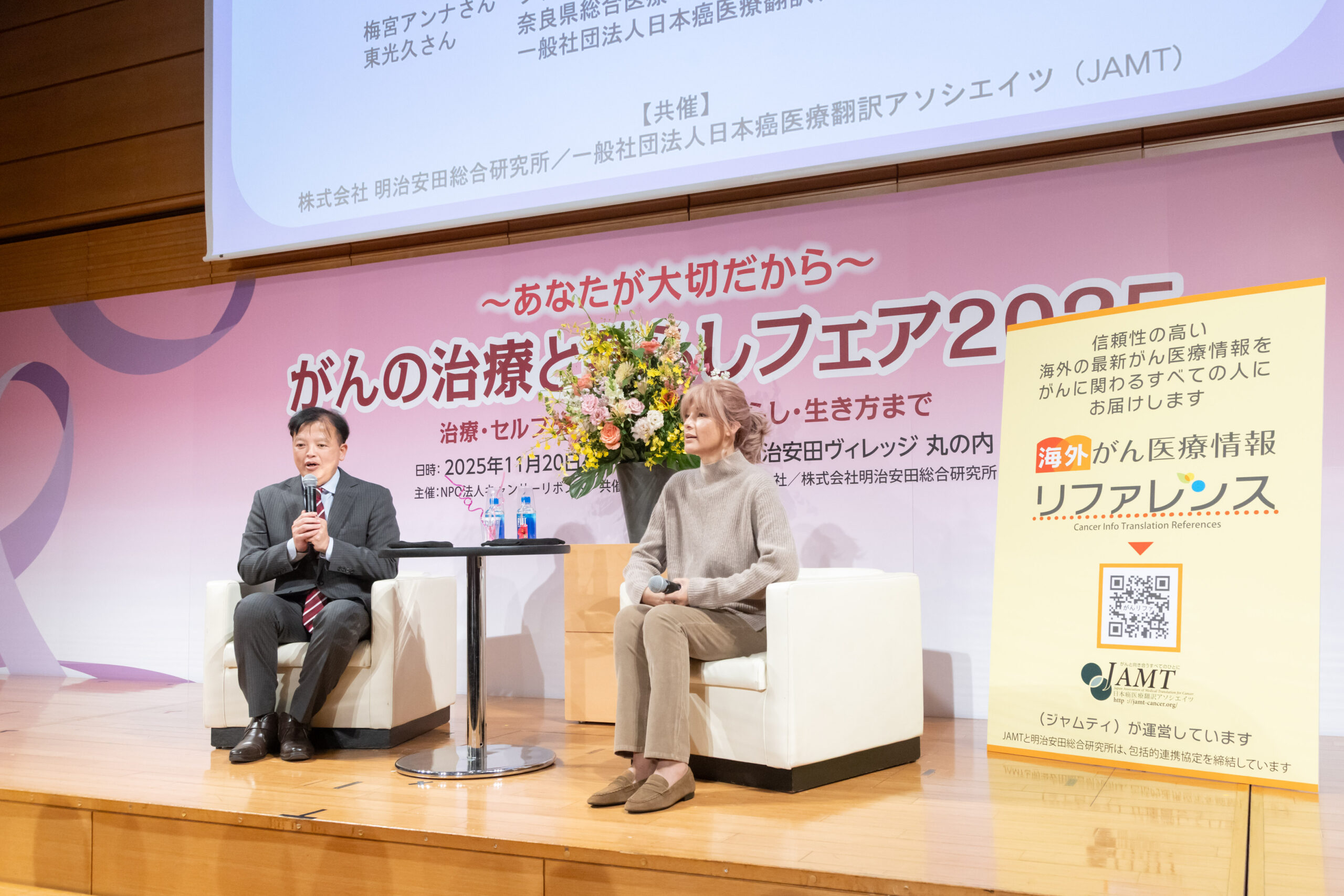 JAMTは、明治安田総合研究所様との共催イベントとして梅宮アンナさんをお招きして、当法人理事の東 光久医師(奈良県総合医療センター総合診療科部長)が「治療だけでは終わらない ~がんとともに歩む、暮らしのリアルと選択~」と題した対談を行いました。正しい情報を選択することの大切さを伝え、闘病とその後続く日常生活のリアルな悩みや課題へ向き合い、ポジティブに進むアンナさんのお話に、満席の会場から大きな拍手が送られました。